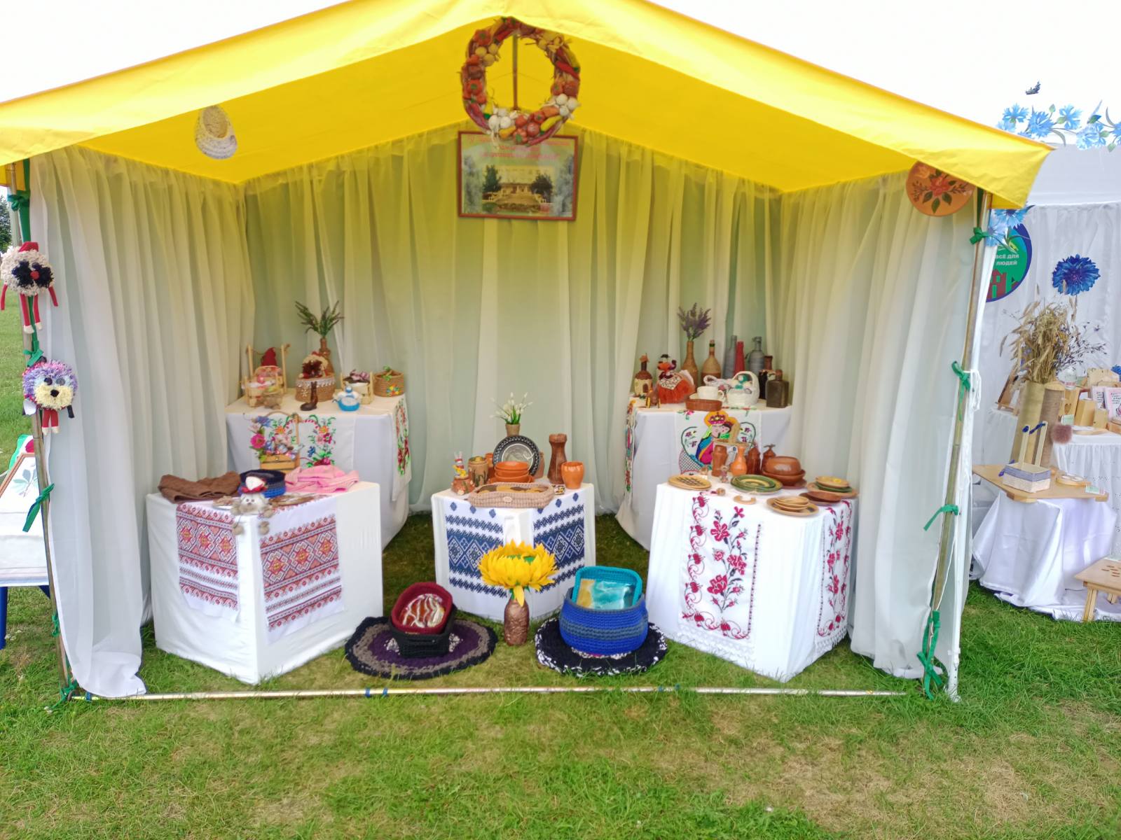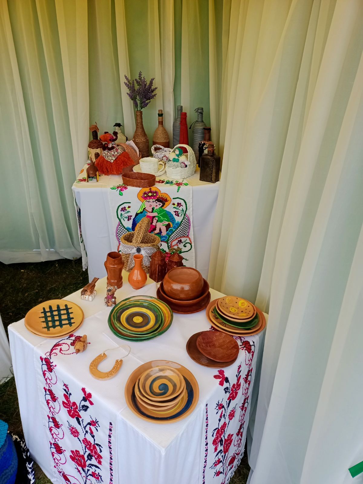 На выставке представлены, вышивка крестом, куклы-обереги, изделия из глины, бисера, льна и шпагата, декоративные подушки, вазы, корзины, шкатулки