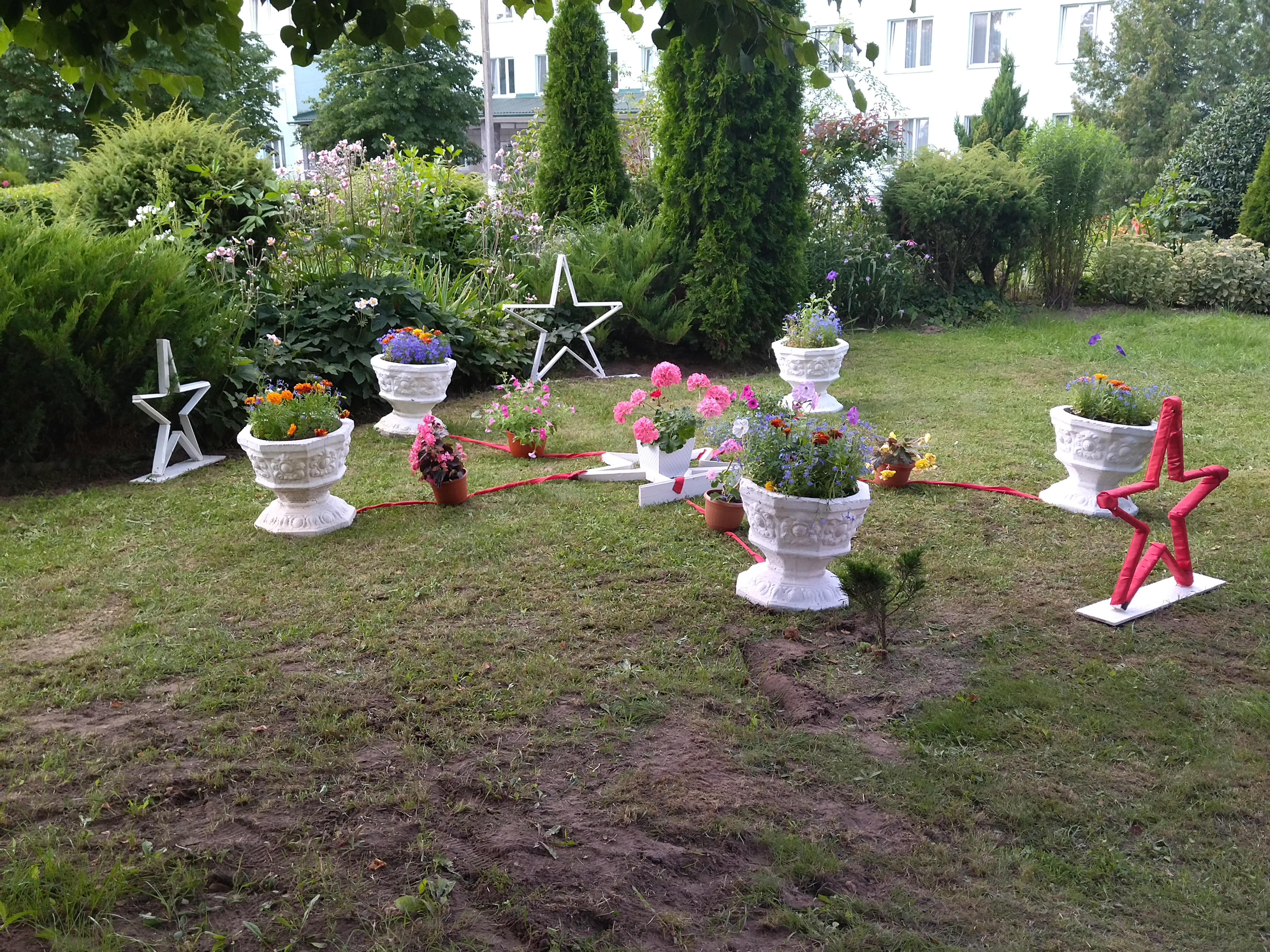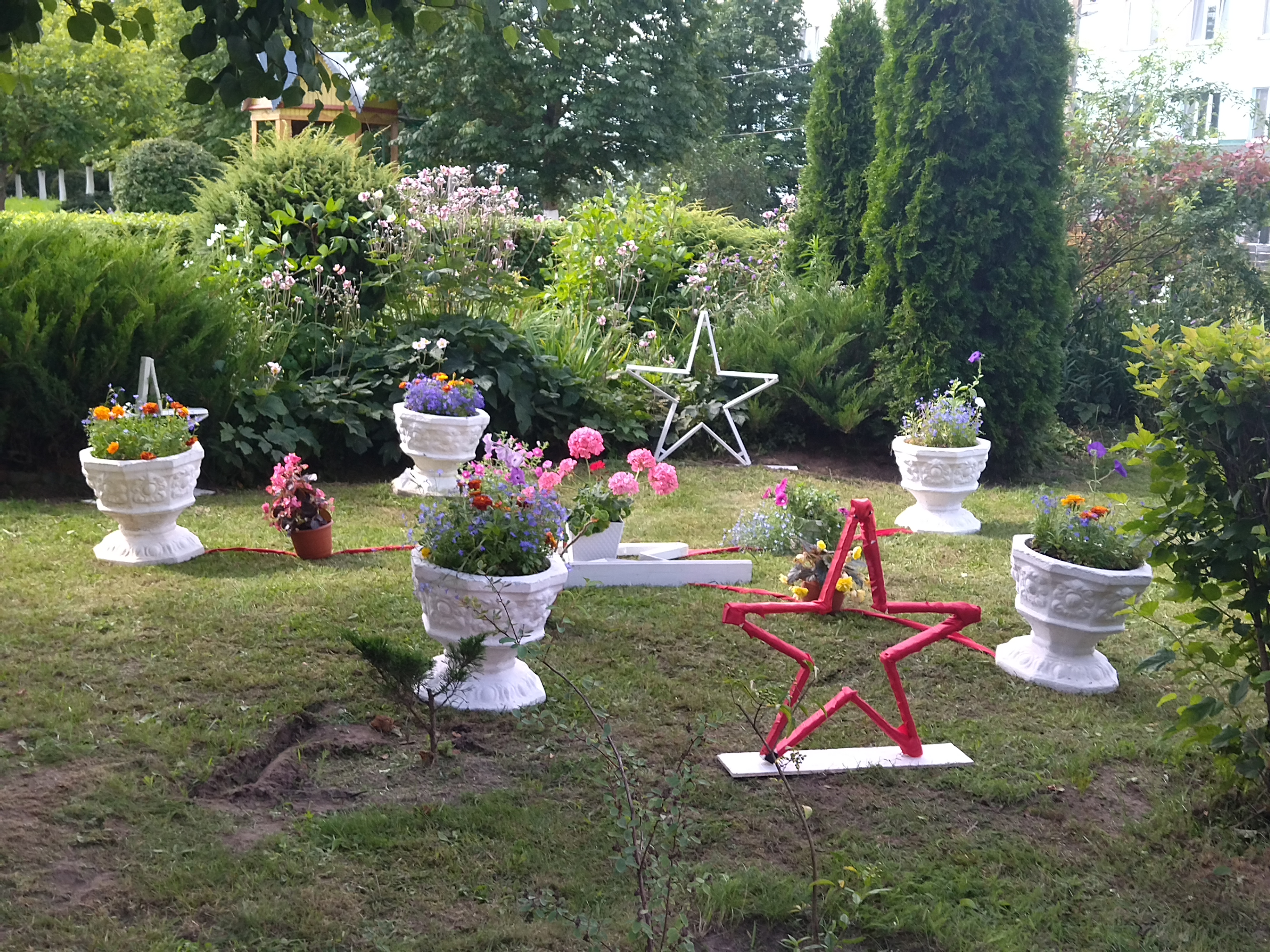 Композиция состоит из декоративных вазонов, с цветущими цветами, выстроенными в виде пятиконечной звезды. В центре композиции расположена звезда, от которой уходят лучи и соединяются с вазонами. На лучах так же расположены вазоны с цветами. Композицию дополняют пятиконечные звезды, символизирующие Победу. В вазонах растут яркие цветы: лобелии ампельные, пеларгонии, бегония, петунии, бархатцы.