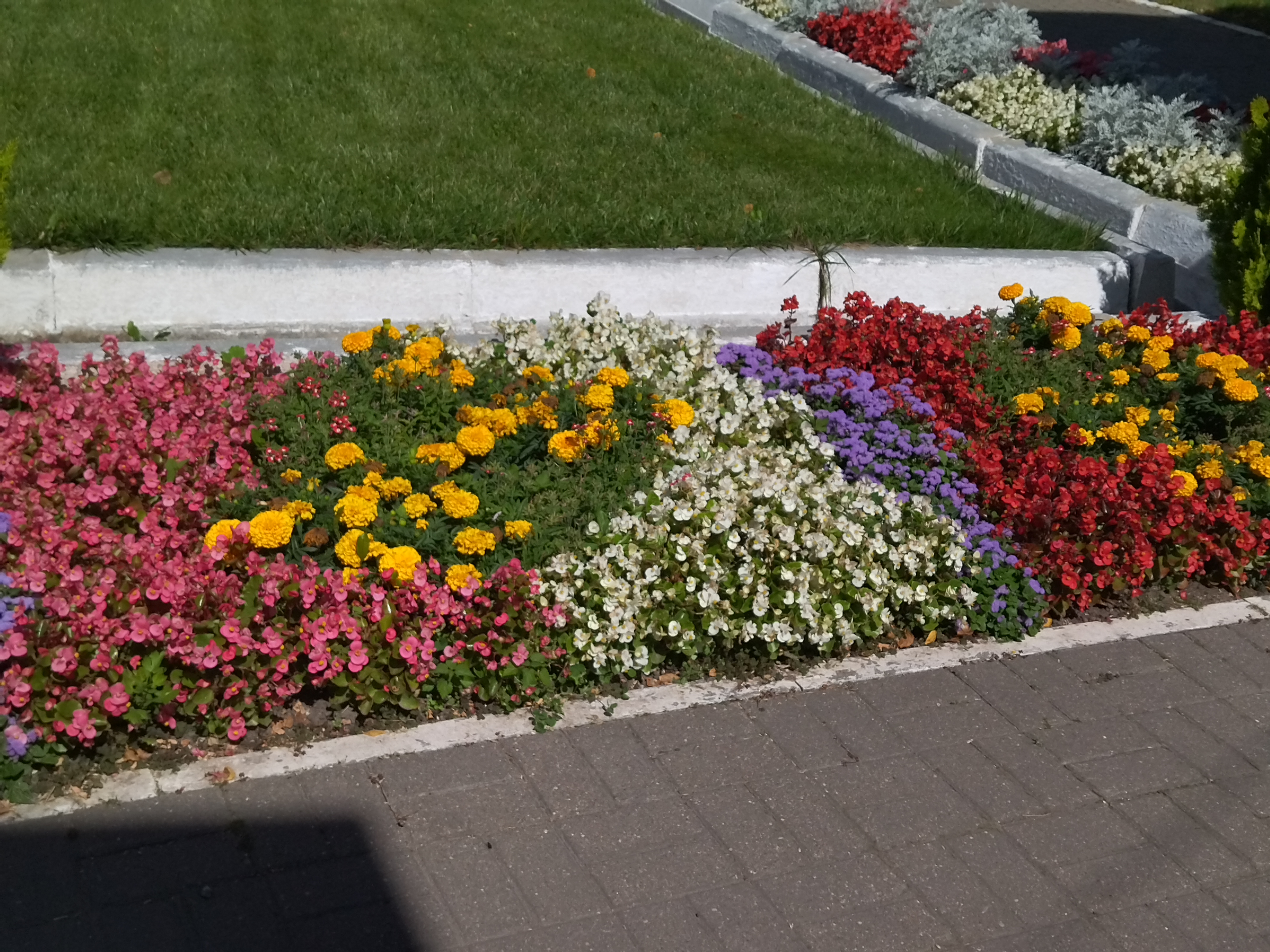 Бордюрная рабатка расположена возле проезжей дороги, имеет прямоугольную форму. Яркие цветные пятна, в виде треугольников, разных цветов делают ее очень красивой. Рабатку украшают бегонии белые, красные, розовые, пушистые помпончики агератума, крупные бархатцы и серебристо-пепельные цинерарии.