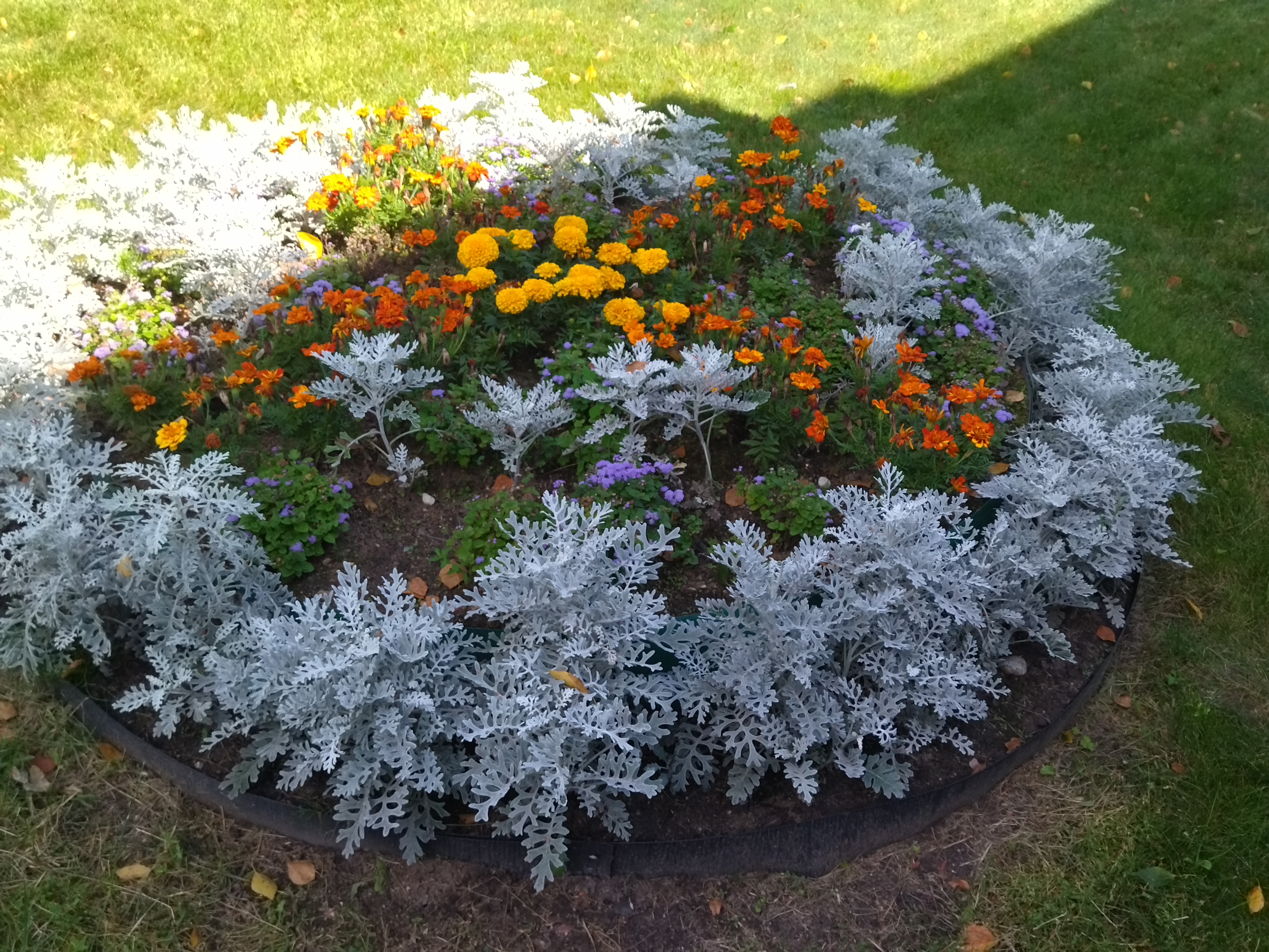 Клумба-цветник правильной геометрической формы. На клумбе в центре высажены бархатцы крупные и мелкие, агератум, пушистые помпончики голубого цвета, которые украшают клумбу, а очаровательное растение цинерария своим серебристо-пепельным оттенком придает клумбе нарядный вид.