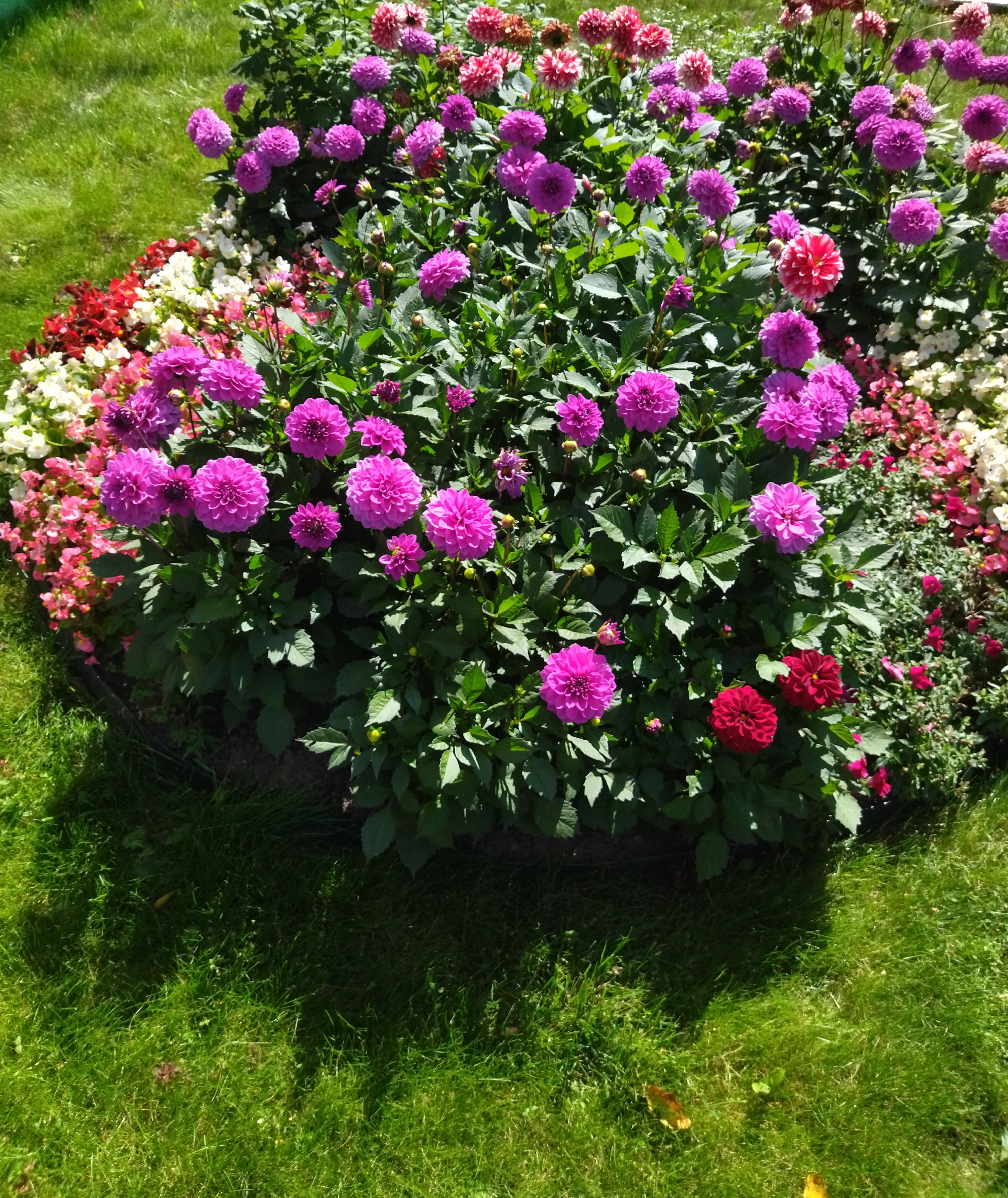 Клумба-цветник правильной геометрической формы. Клумбу можно осмотреть с любой стороны. На клумбе высажены яркие фиолетовые и красно-белые георгины, а обрамляют их нежные бегонии разных цветов.