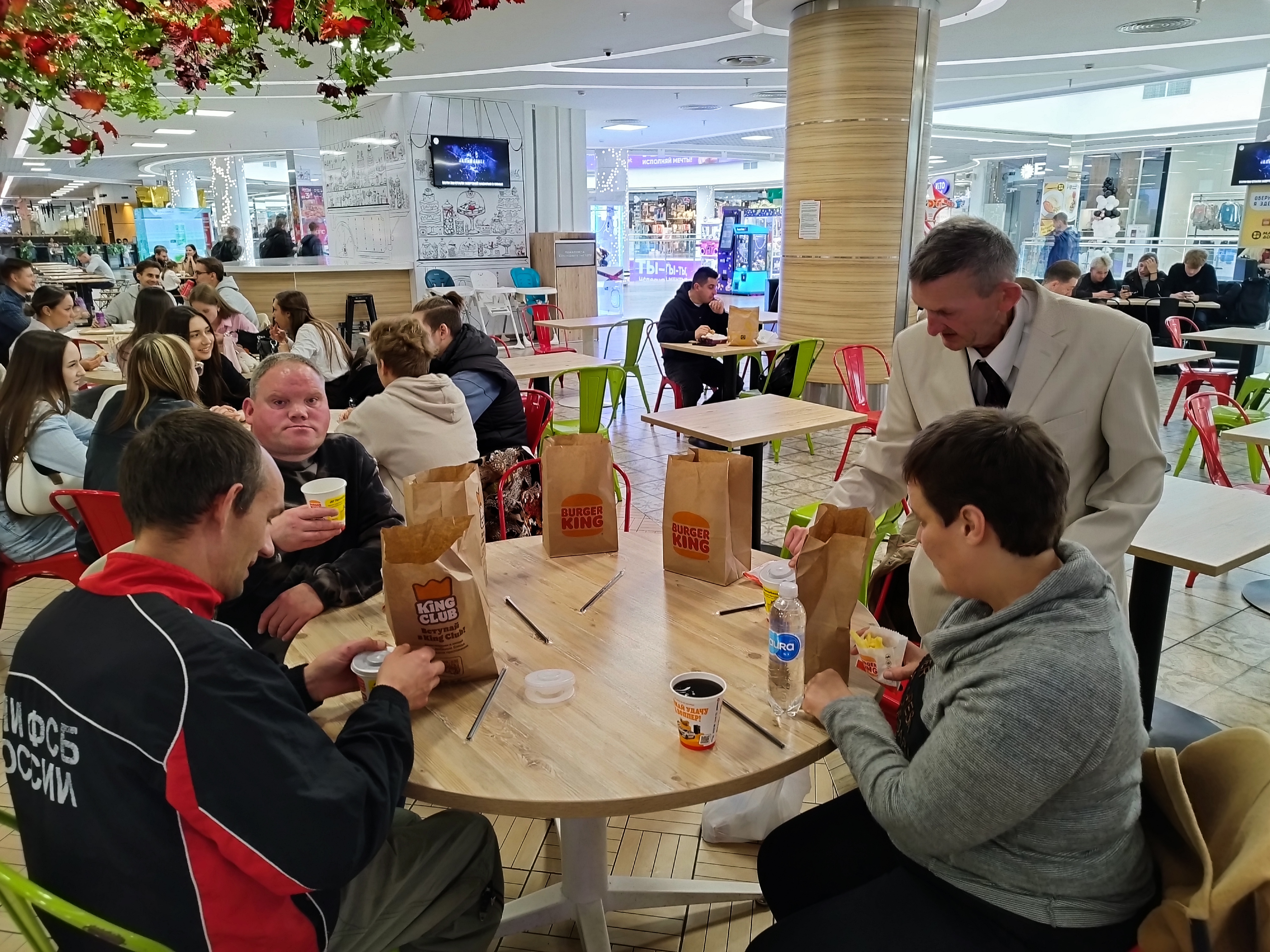 После просмотра мультфильма, все расположились в одном из кафе. Где организаторы экскурсии угостили наших проживающих вкусным обедом и с удовольствием пообщались с ними. В свою очередь ребята от всей души поблагодарили их за прекрасную возможность погрузиться в мир киноискусства и побывать в таком замечательном месте.  Ведь ничто так не радует сердце, как теплое душевное общение с близкими и друзьями.
