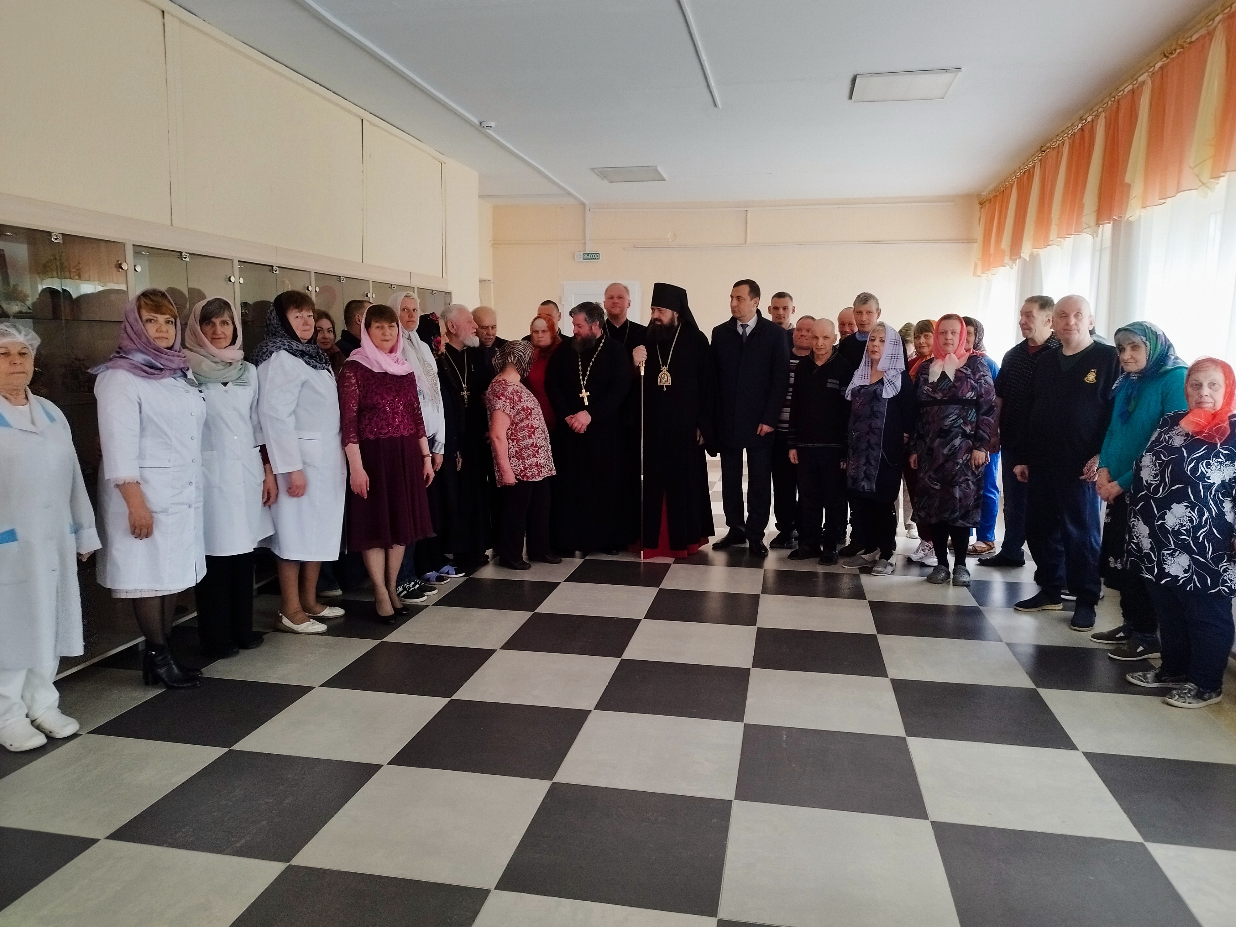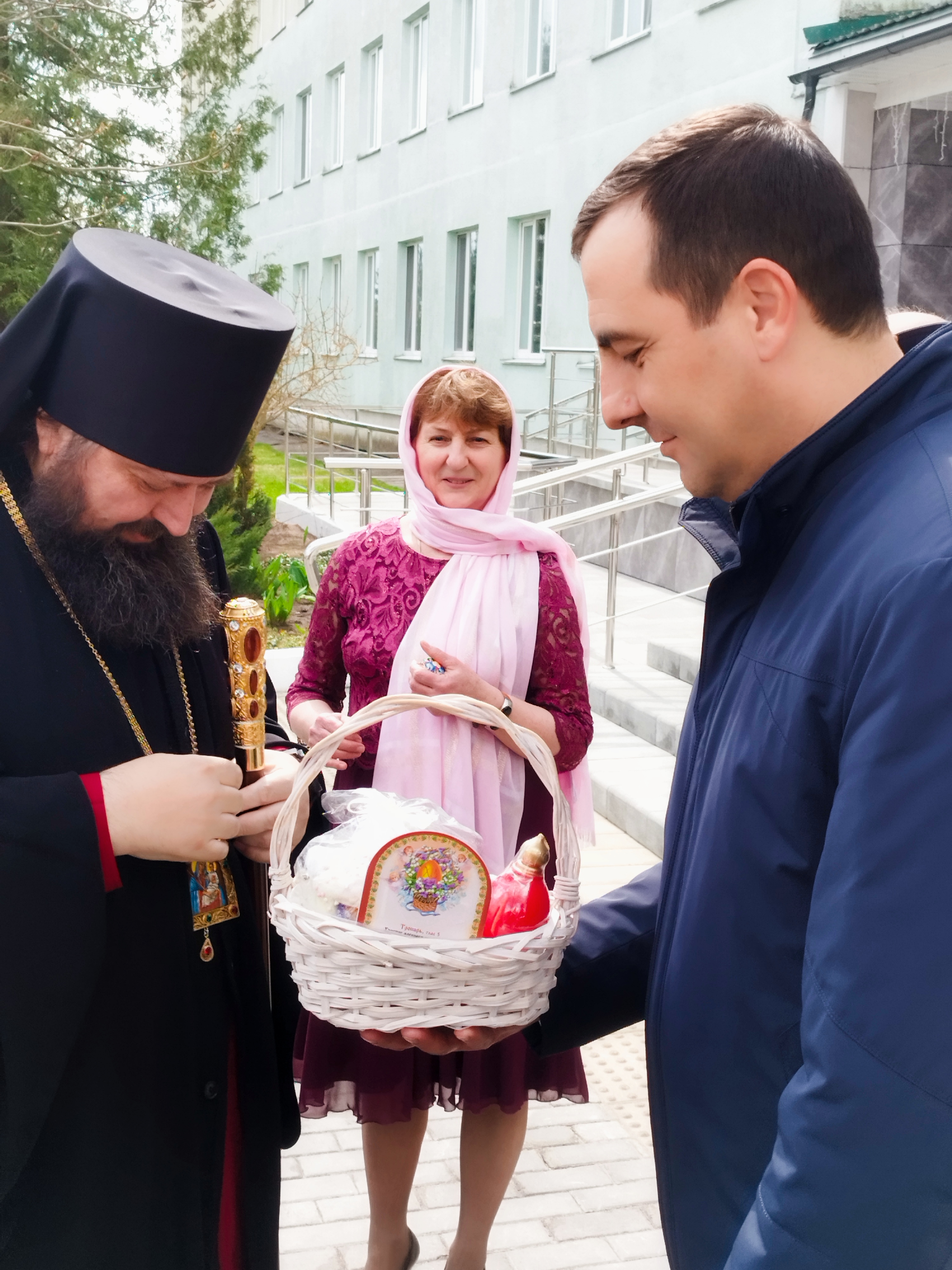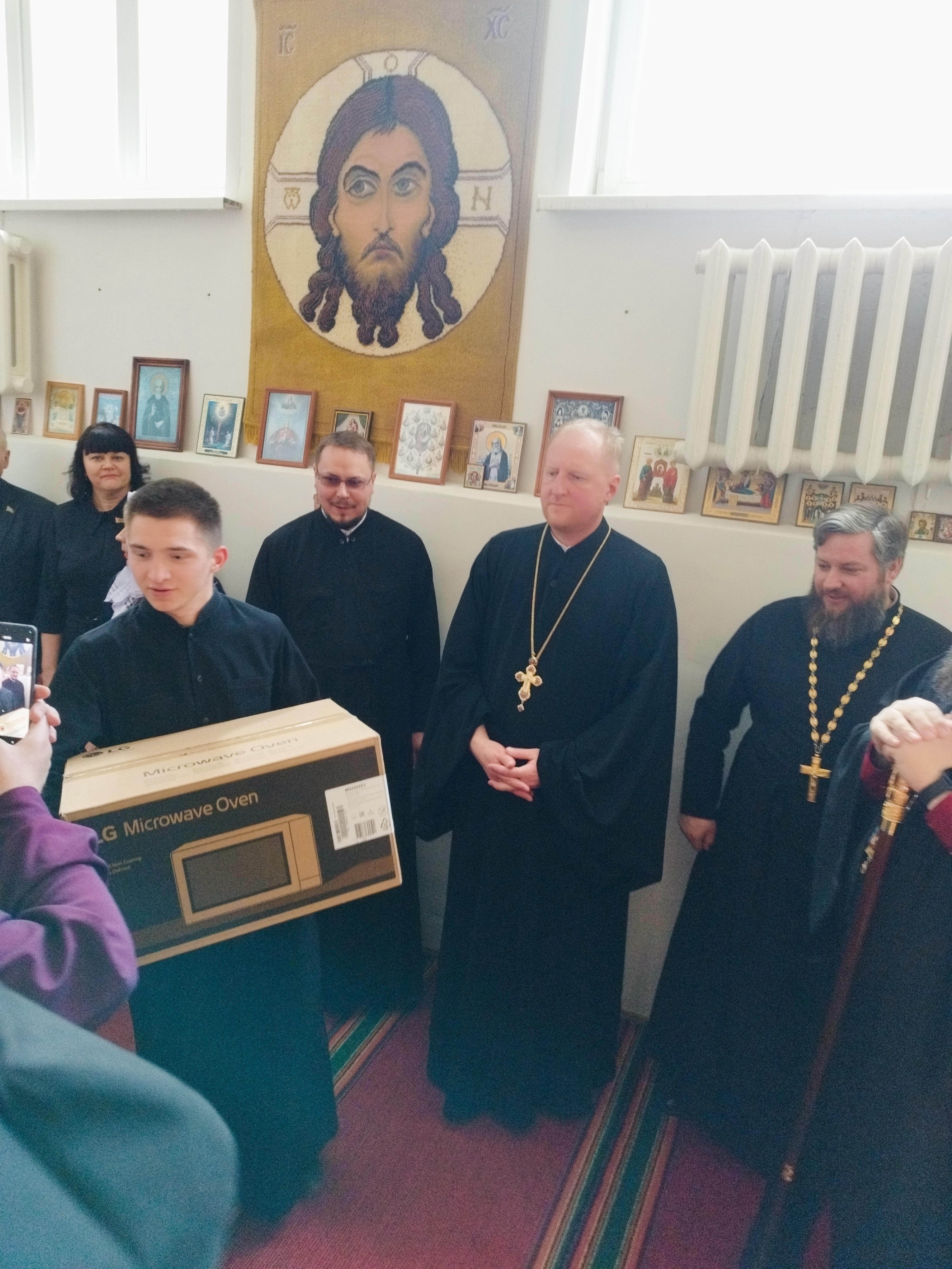 Христос Воскресе — тепло приветствовал в молитвенной комнате сотрудников и проживающих пансионата епископ Амвросий. В гости он приехал с подарком: микроволновой печью.